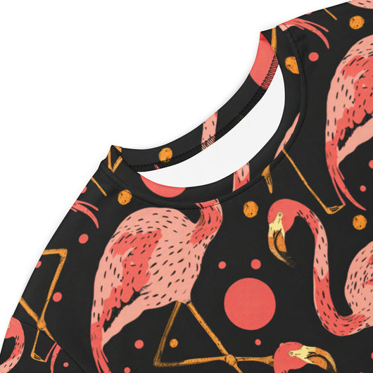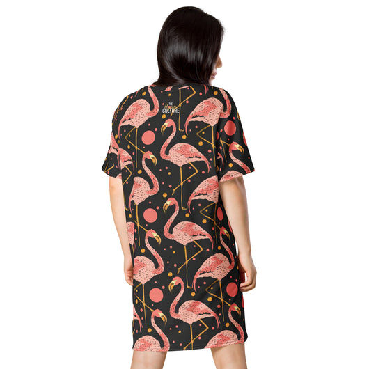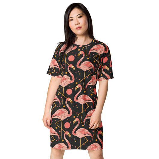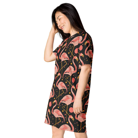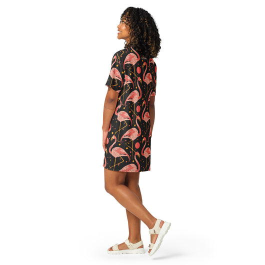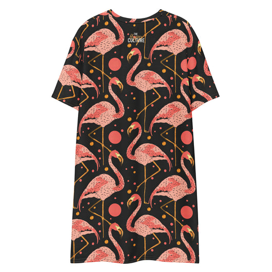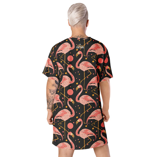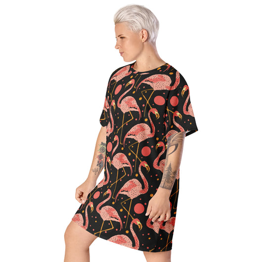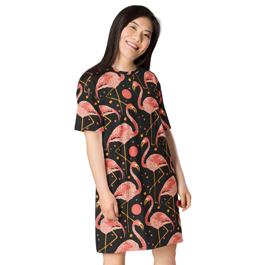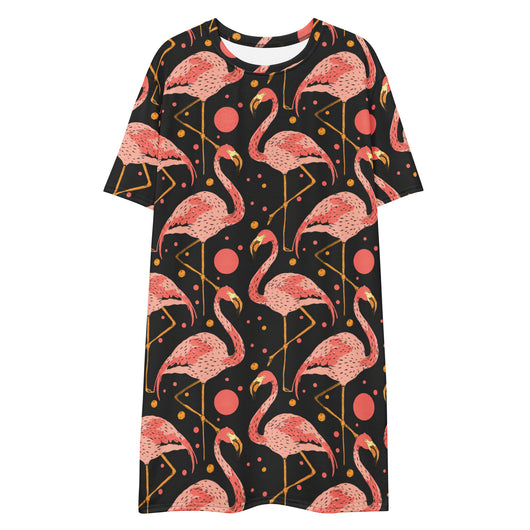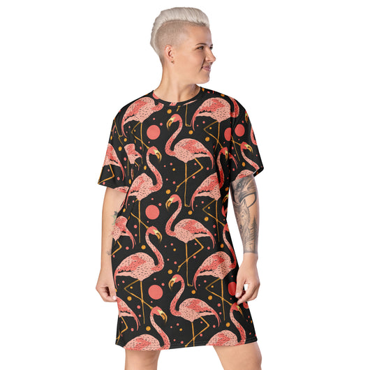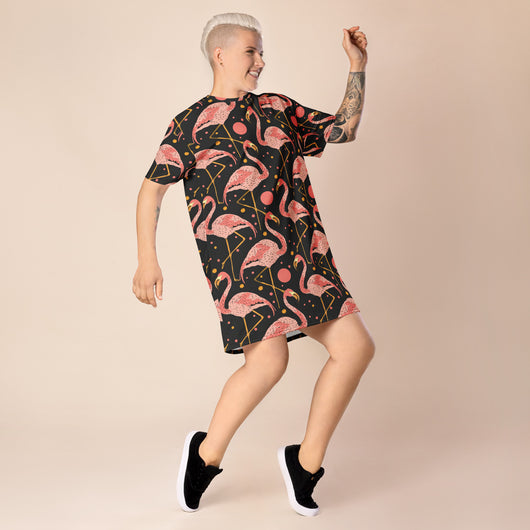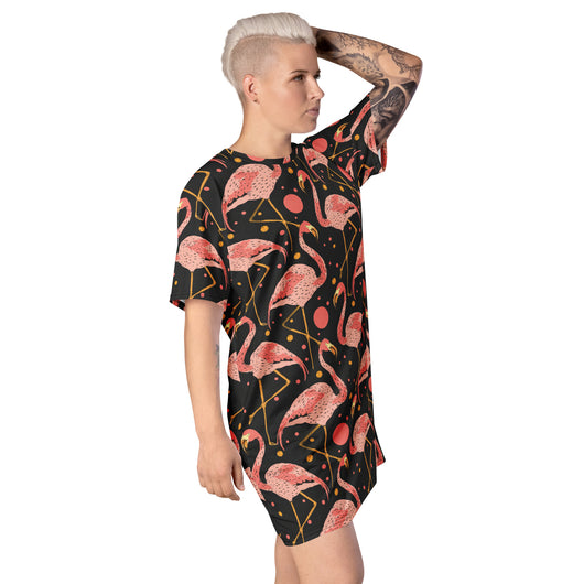 2XS - 6XL | Step into style with this beautiful flamingos on black background. Perfect for sneakers or heels, this versatile oversized t-shirt dress lets you create a unique look. Shine and make a statement wherever you go!