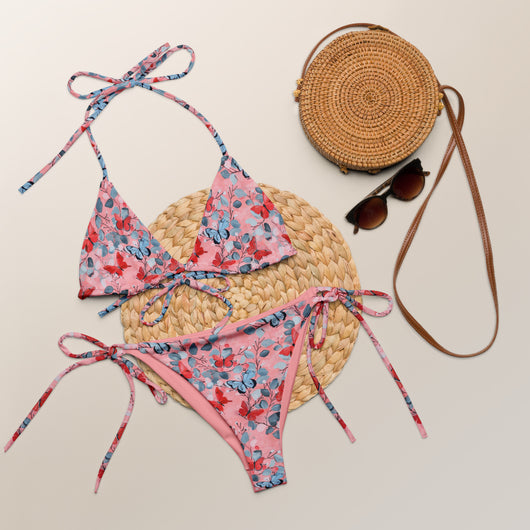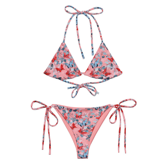 Stay comfortable and stylish all summer with this Flutter Kiss Recycled String Bikini set, featuring a beautiful butterfly print on luscious pink background. Made from soft recycled polyester with double-layering and UPF 50+ protection, this floral bikini offers both comfort and sun safety. Available in sizes 2XS to 6XL, you can style the straps however you like and get ready to swim in this beautiful pink swimwear.