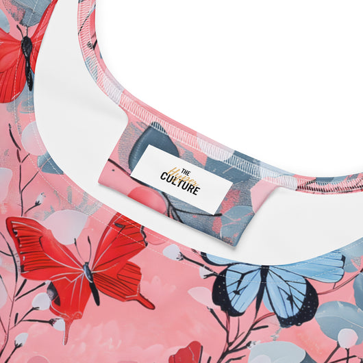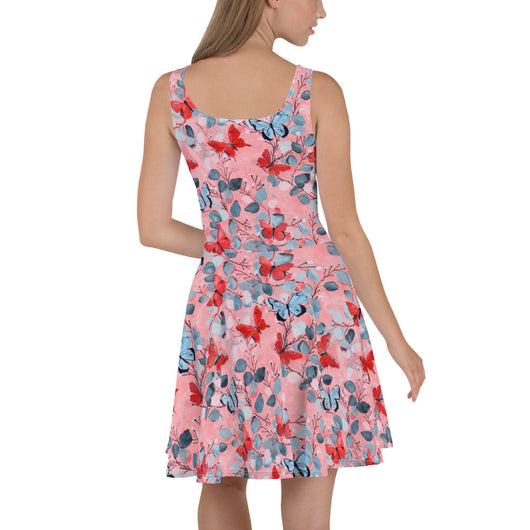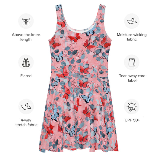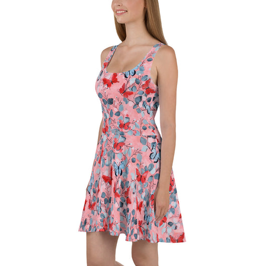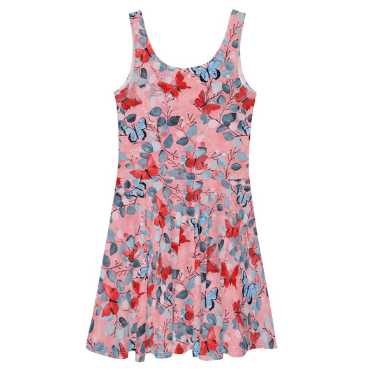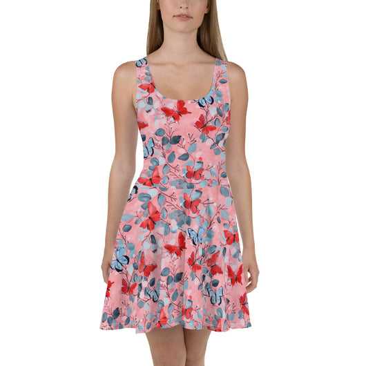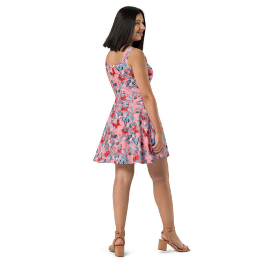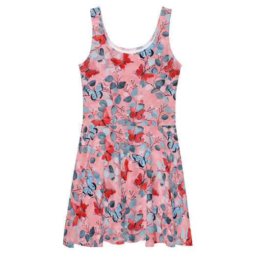 Dress to impress with this sleeveless yellow skater dress, adorned with a beautiful butterfly print on luscious pink background. The soft fabric and flared skirt provide an elegant twist, showcasing the intricate design in vibrant detail. Perfect for summer, this stunning dress is available in sizes XS to 3XL. Elevate your wardrobe with this must-have summer dress.