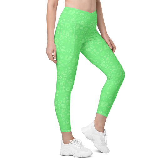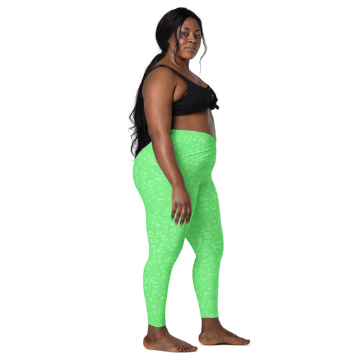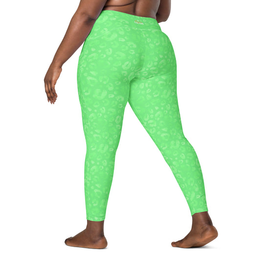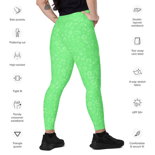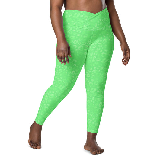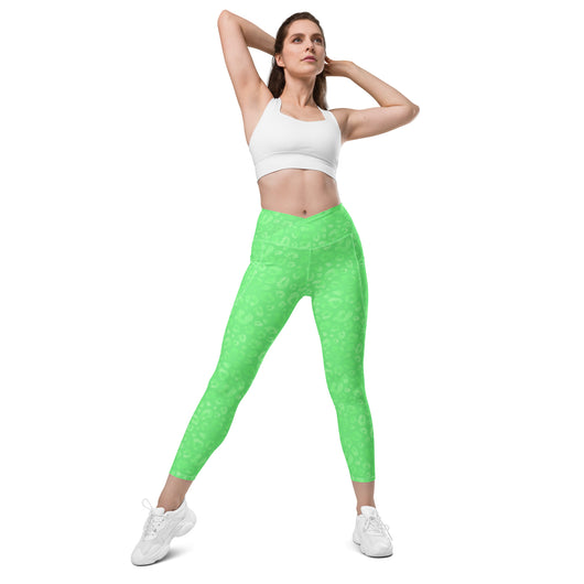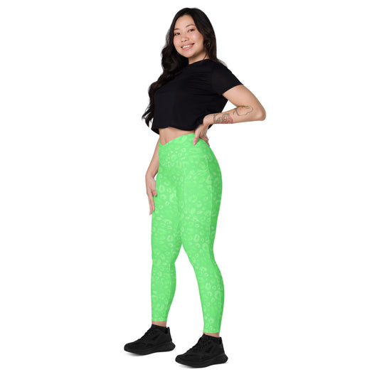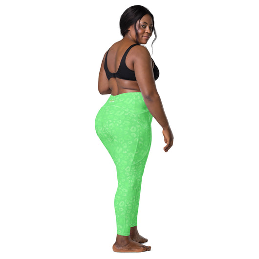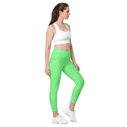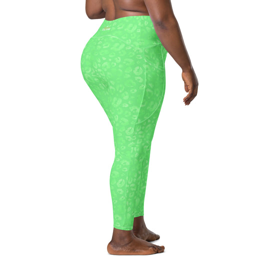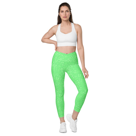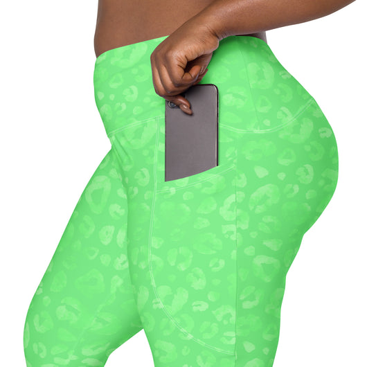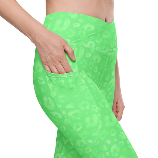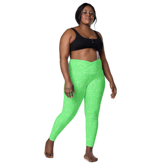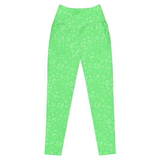 2XS - 6XL | Treat yourself to trendy and flattering crossover leggings with pockets. Enjoy exceptional comfort during your training and keep your valuables close with practical side pockets. Featuring a gorgeous apple green leopard print.