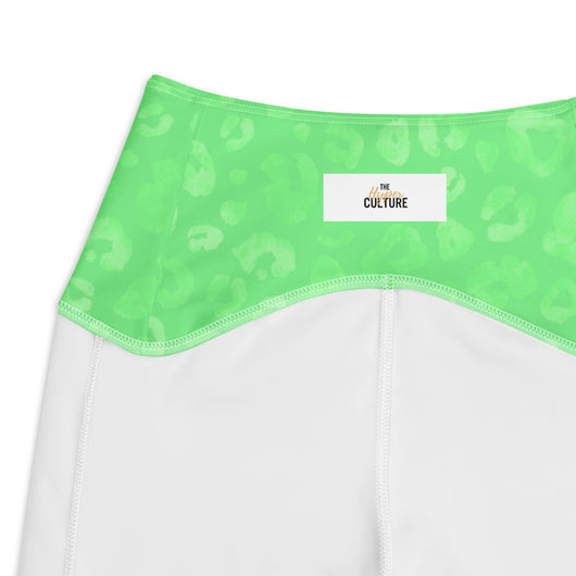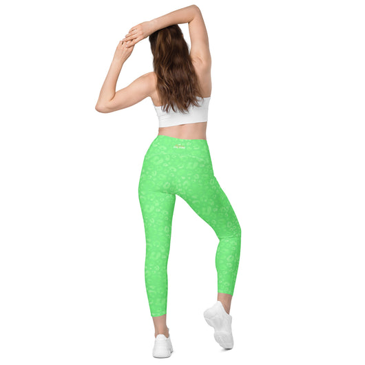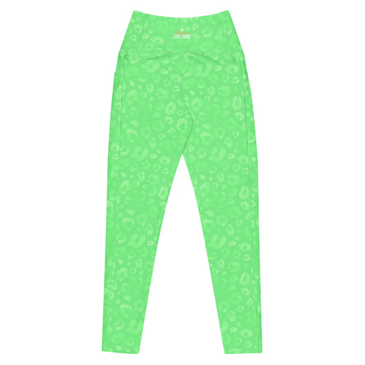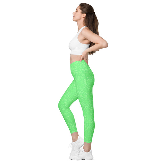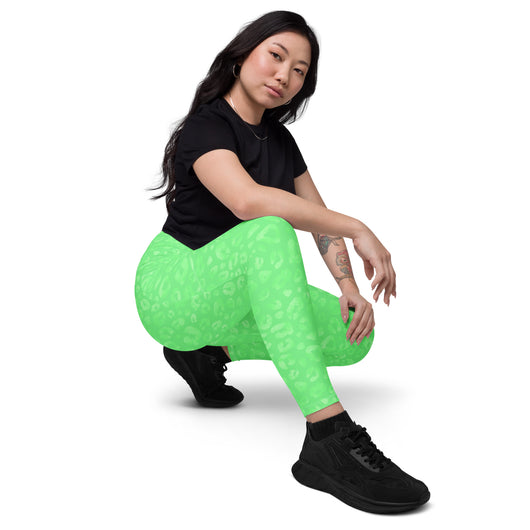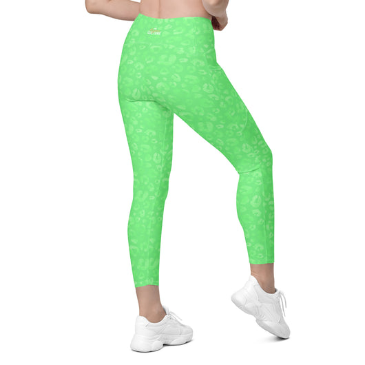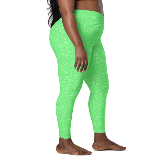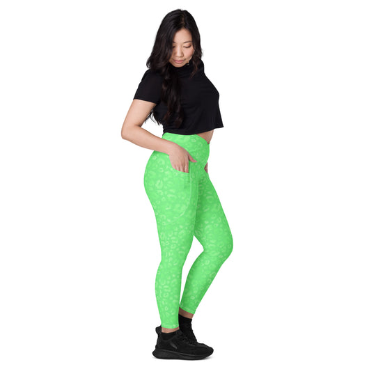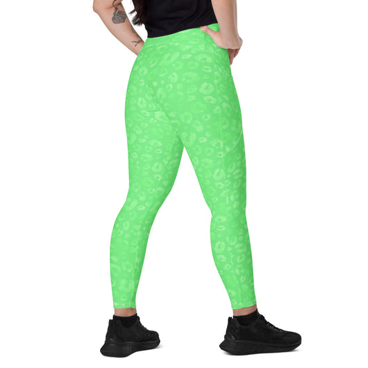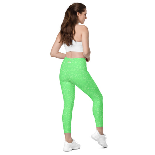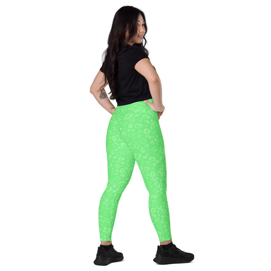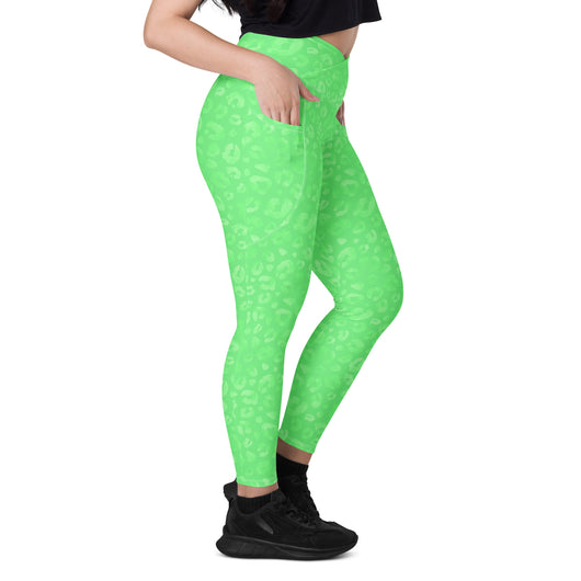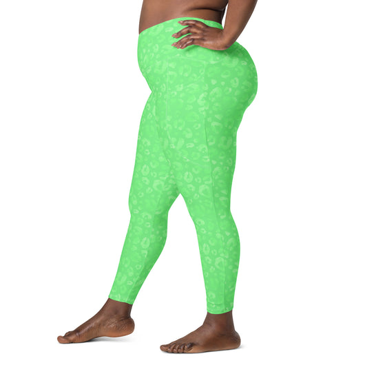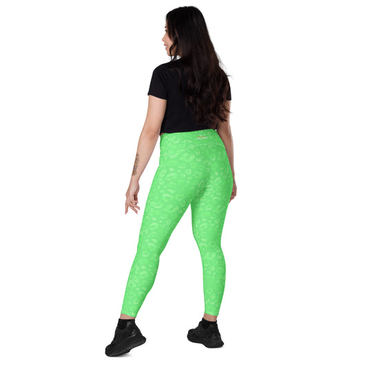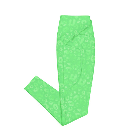 2XS - 6XL | Treat yourself to trendy and flattering crossover leggings with pockets. Enjoy exceptional comfort during your training and keep your valuables close with practical side pockets. Featuring a gorgeous apple green leopard print.