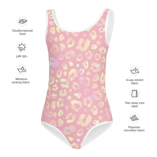 Make a splash with this girls' swimsuit! Featuring a gorgeous pink leopard print, it’s got all the vibes. Comfy fit, stretchy fabric, and fade-resistant colors keep it fresh. With a double-layered front, bias binding, and 38–40 UPF, it's perfect for active kids and worry-free parents. Dive in!