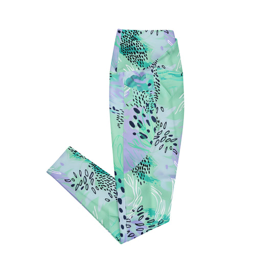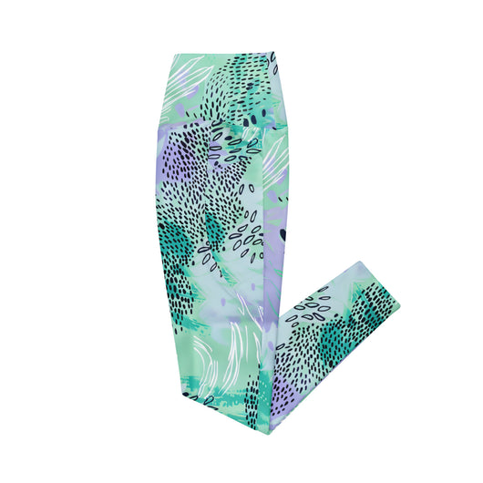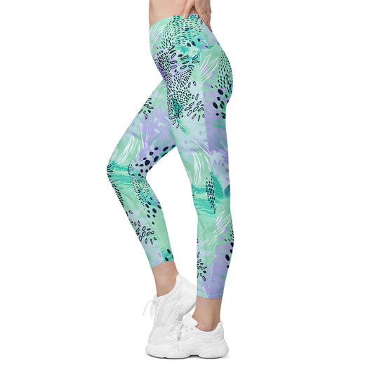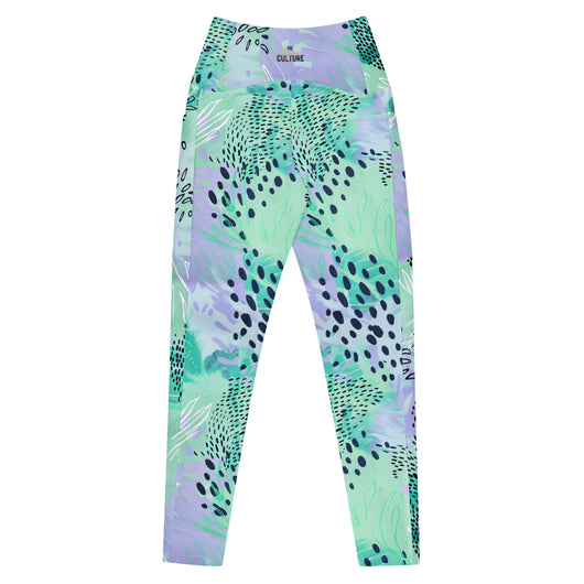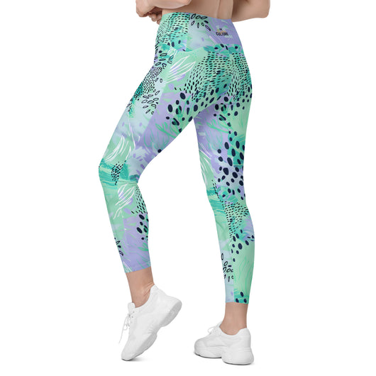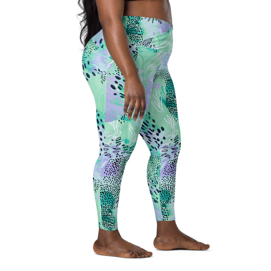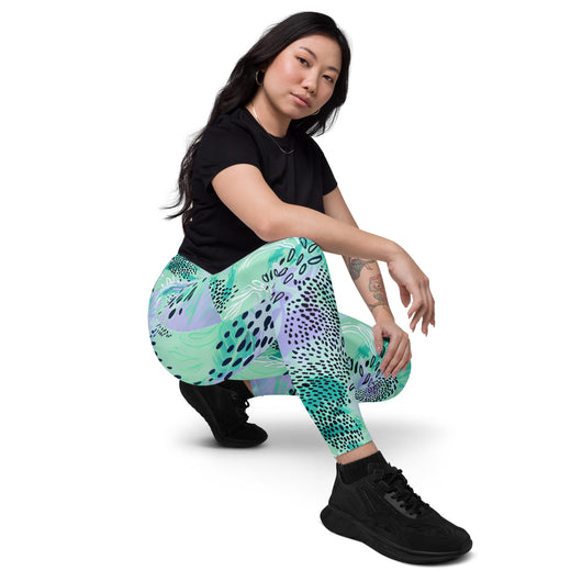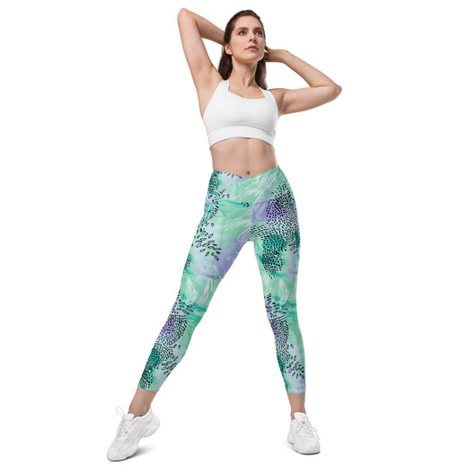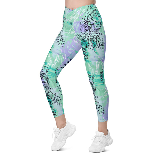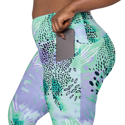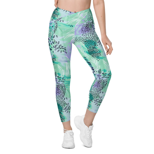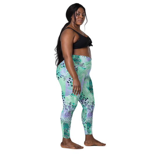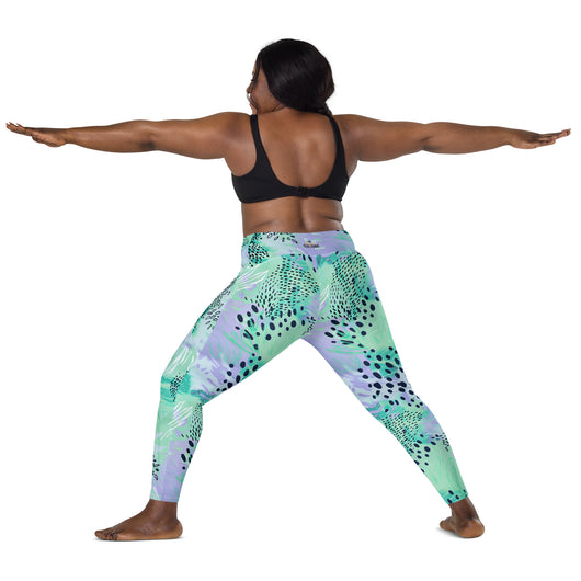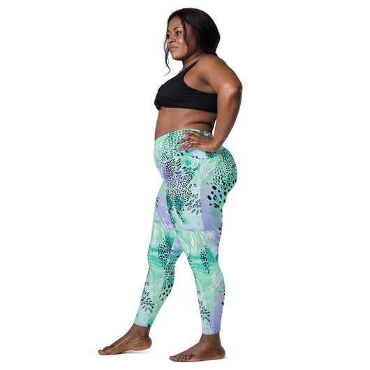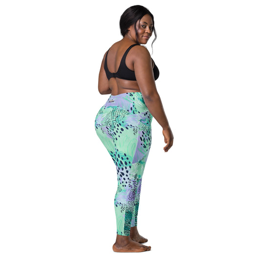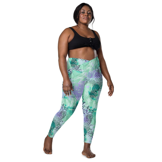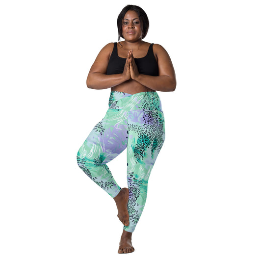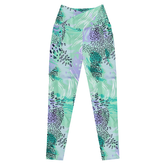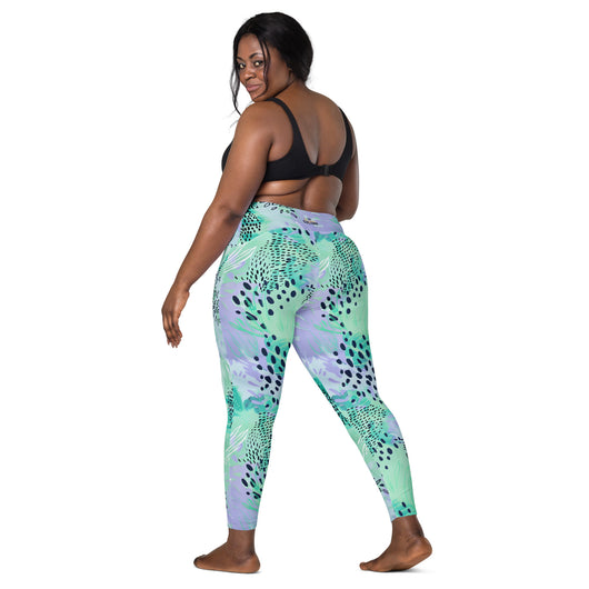 2XS - 6XL | Treat yourself to trendy and flattering crossover leggings with pockets. Enjoy exceptional comfort during your training and keep your valuables close with practical side pockets. Featuring an abstract green and purple wild print.